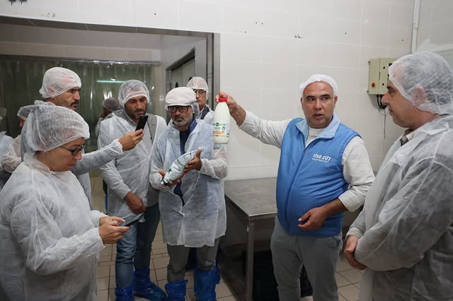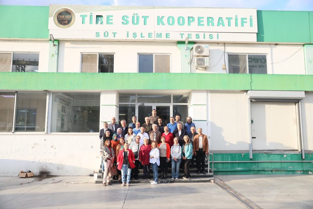 Tire Süt Kooperatifi tesislerinde gerçekleştirilen ziyarette, kooperatifin üretim süreçleri, kalite standartları, pazarlama faaliyetleri ve üreticiye sağladığı katkılar yerinde incelendi.